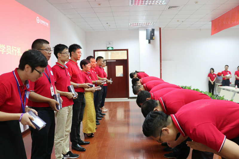 開班儀式上舉行了莊嚴(yán)的拜師儀式,42位儲(chǔ)備高管分別給老師們行拱手禮,感謝老師們的悉心栽培,從此發(fā)奮圖強(qiáng),為公司的事業(yè)再創(chuàng)輝煌,老師們贈(zèng)書給學(xué)員作為回贈(zèng)。