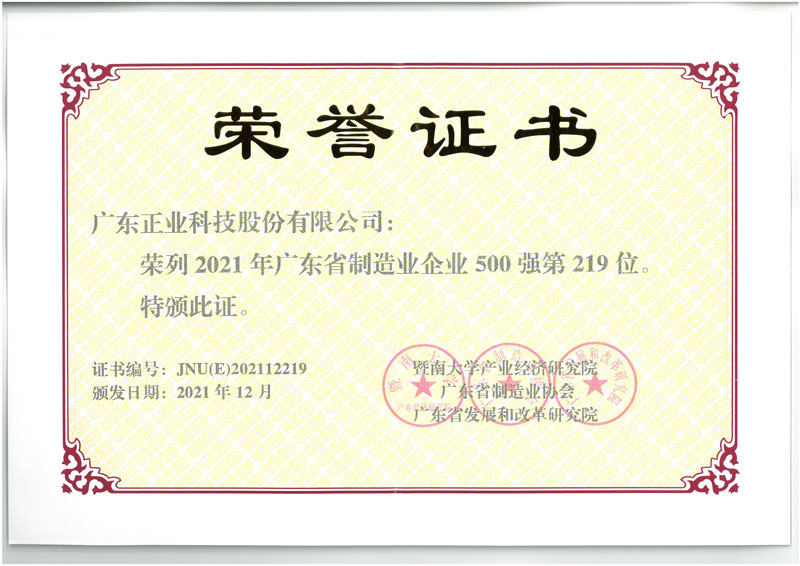 喜訊 | 正業科技榮膺2021年“廣東省制造業企業500強”!