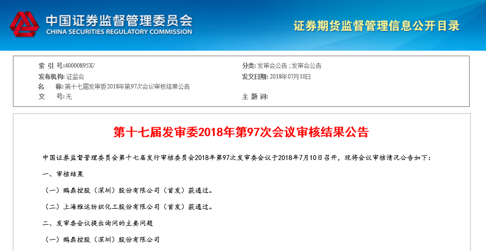 據證監會7月10號發布的《第十七屆發審委2018年第97次會議審核結果公告》顯示,為正業科技2017年度第一大客戶的鵬鼎控股(深圳)股份有限公司(以下簡稱“鵬鼎控股”)首發申請獲通過。